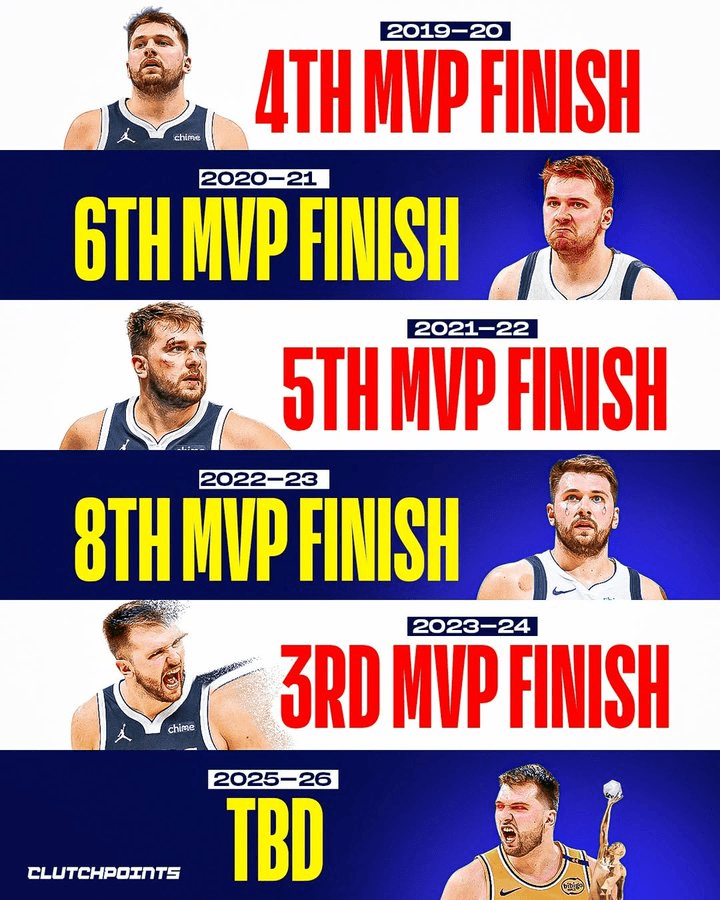 虎扑03月27日讯美媒ClutchPoints更新动态,晒出东契奇生涯每年的MVP排名情况: